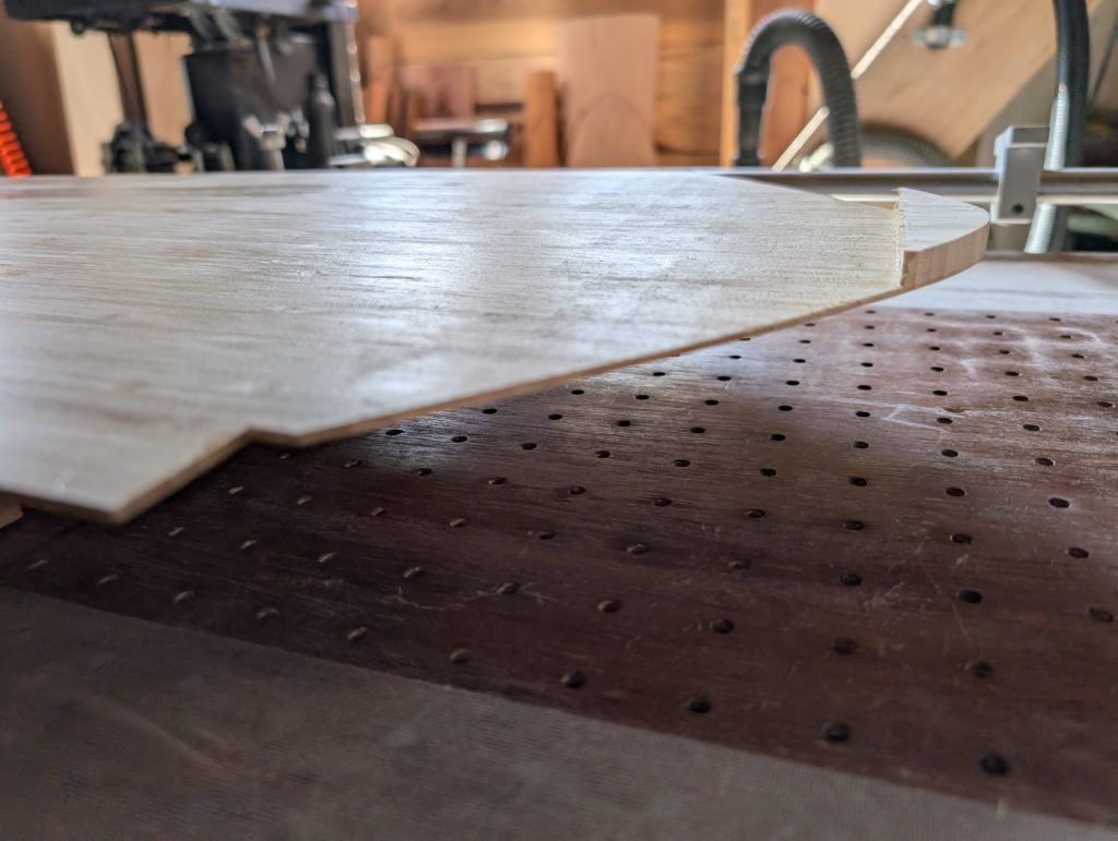 トリマーで0.5mmくらいずつ削っていきます。インサート部分がは6~7mmでそこから1番薄い部分の2.5mmと薄くしていきます。